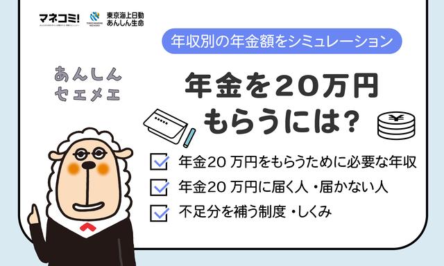 今の生活と将来もらえる年金を考えた時に、具体的に毎月いくら年金をもらえるのか、気になるものです。贅沢はできなくても、老後にある程度ゆとりを持って生活するために、毎月20万円は年金をもらいたいと考える人も少なくないのではないでしょうか。